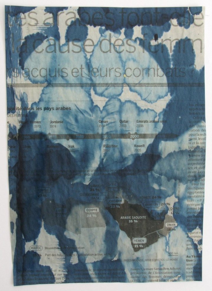 J’ai recyclé des articles de presse que je trouvais intéressants et je les ai augmentés en intervenant en cyanotype. //