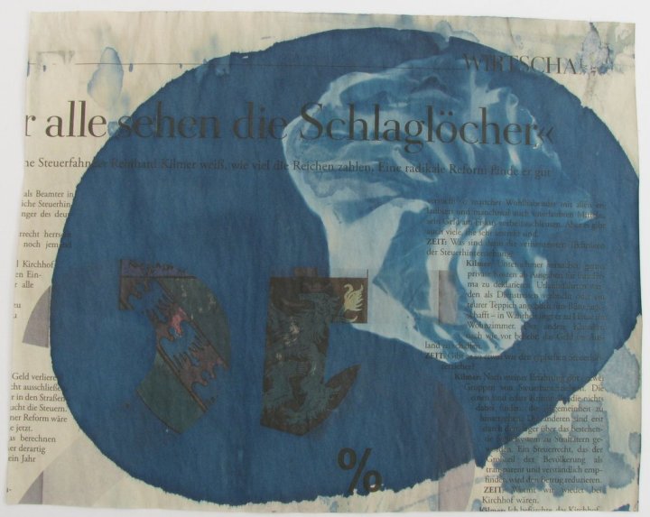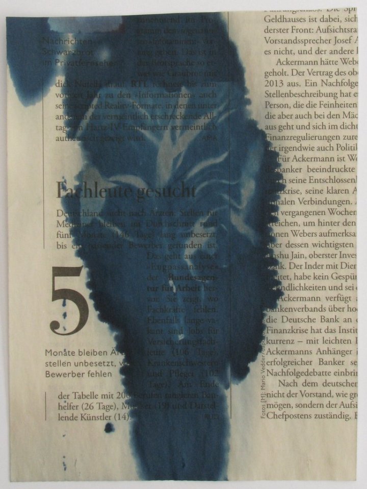 DIE KULTUR! Zeitungspapier, Cyanotyp, unterschiedliche Grössen. Für interessant befundene, überarbeitete Zeitungsartikel.