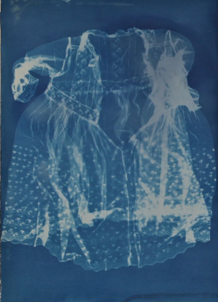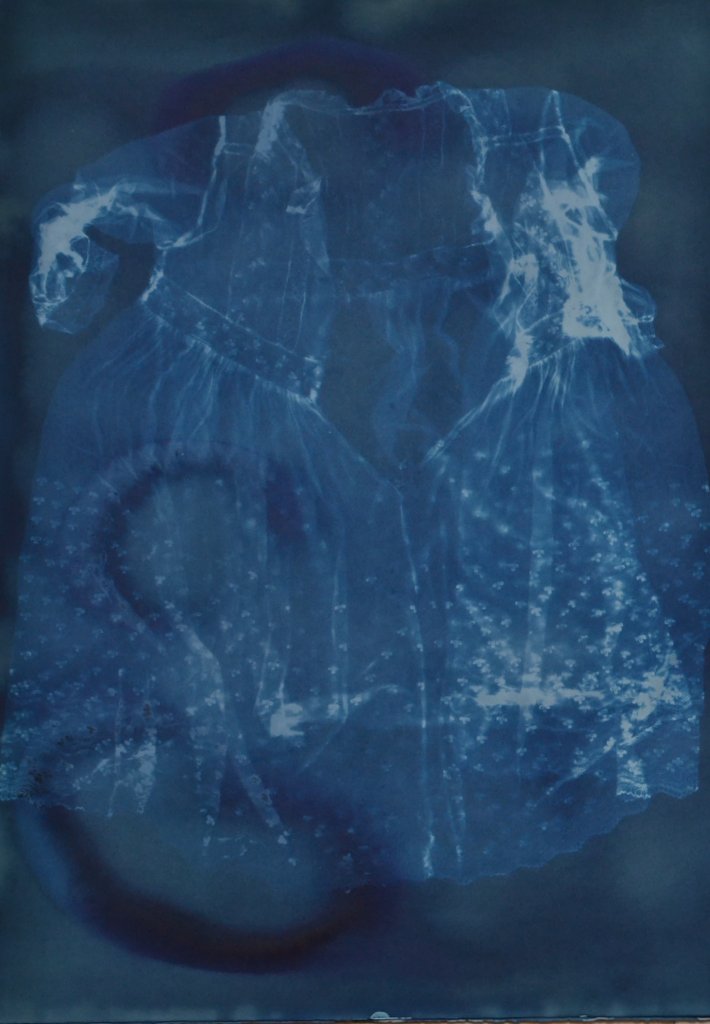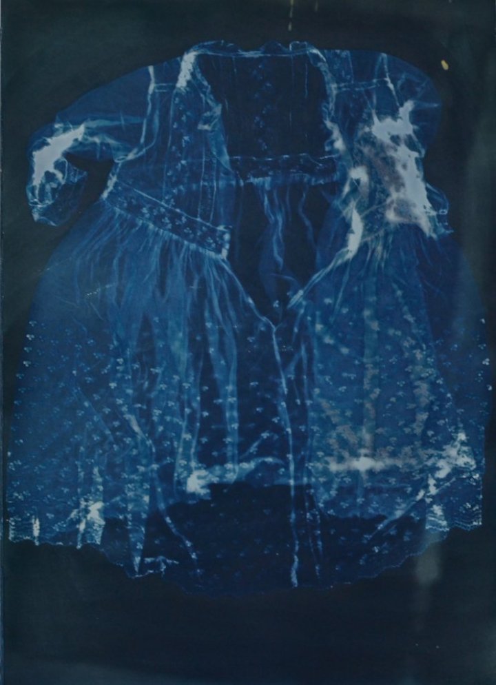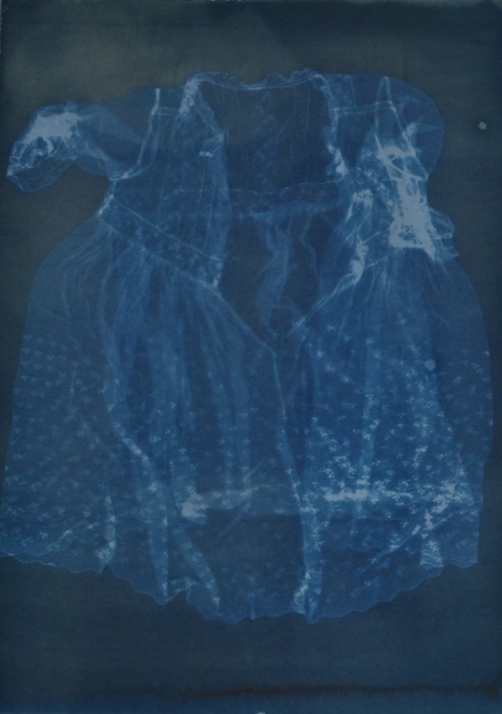 Une semaine ou huit jours de cyanotype sans arrêt, du 9 au 16 décembre 2013, sur 8 feuilles successives. J’ai photographié la robe de baptême avec la technique du cyanotype pendant exactement 24 heures à chaque fois, avec l’aide du soleil et de la lune de décembre. Les variations de couleur s’expliquent par l’intensité de lumière, le temps qu’il faisait chaque jour.