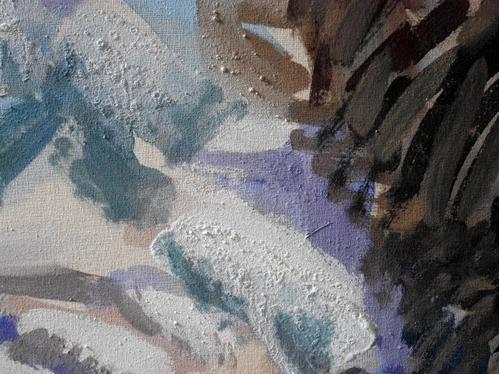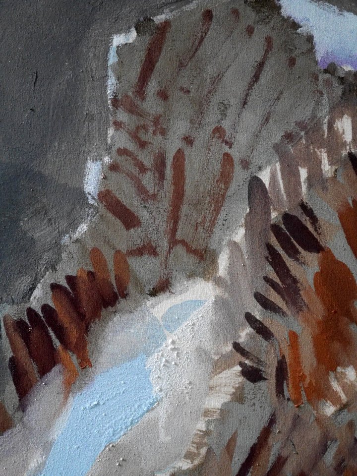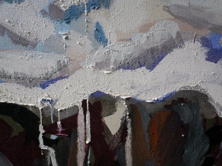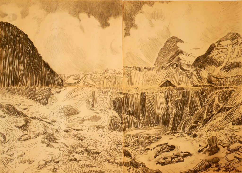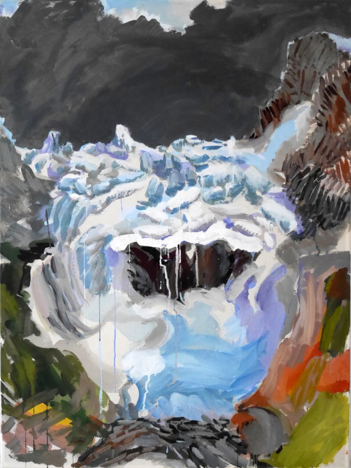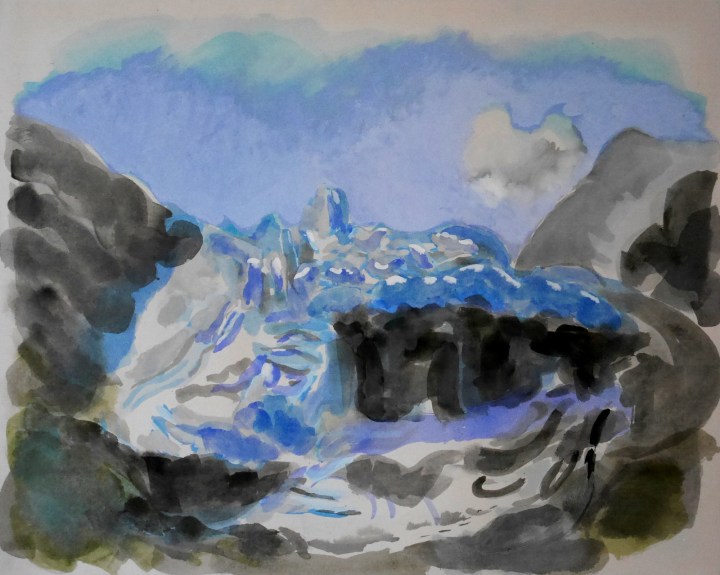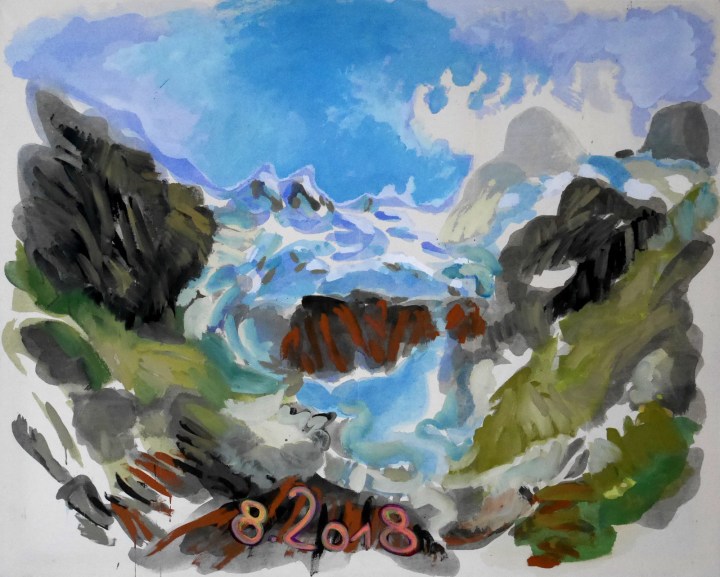 Comment faire rentrer un glacier suisse gigantesque sur une petite toile? Caséine, aquarelle, fusain. // Ein gigantischer schweizer Gletscher, auf einer ziemlich kleinen Leinwand und Papier. Kasein, Aquarell, Kohle.
