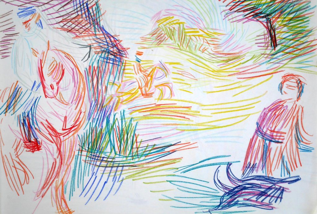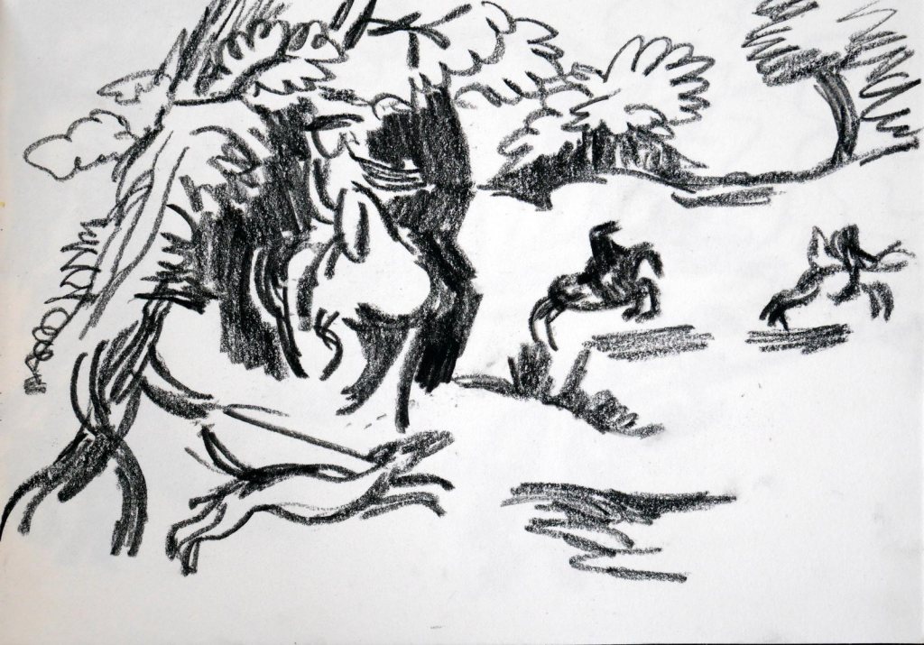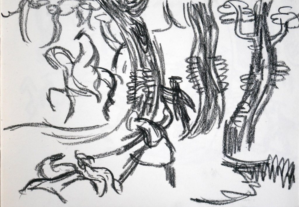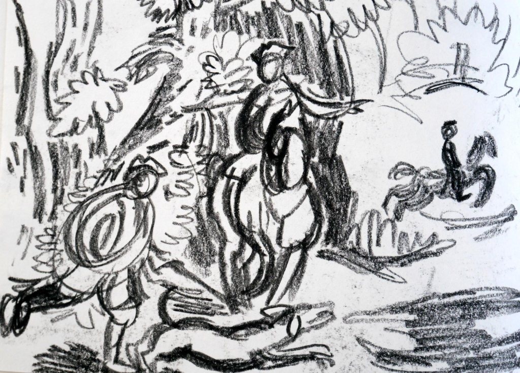Croquis aux crayons de couleur et au fusain avec des fragments d’une scène de chasse, d’après une tapisserie française// Männer, eine Frau, Pferde und Hunde im Wald : Farbstift- und Kohlekizzen nach einem französischen Wandteppich mit einer Jagdszene