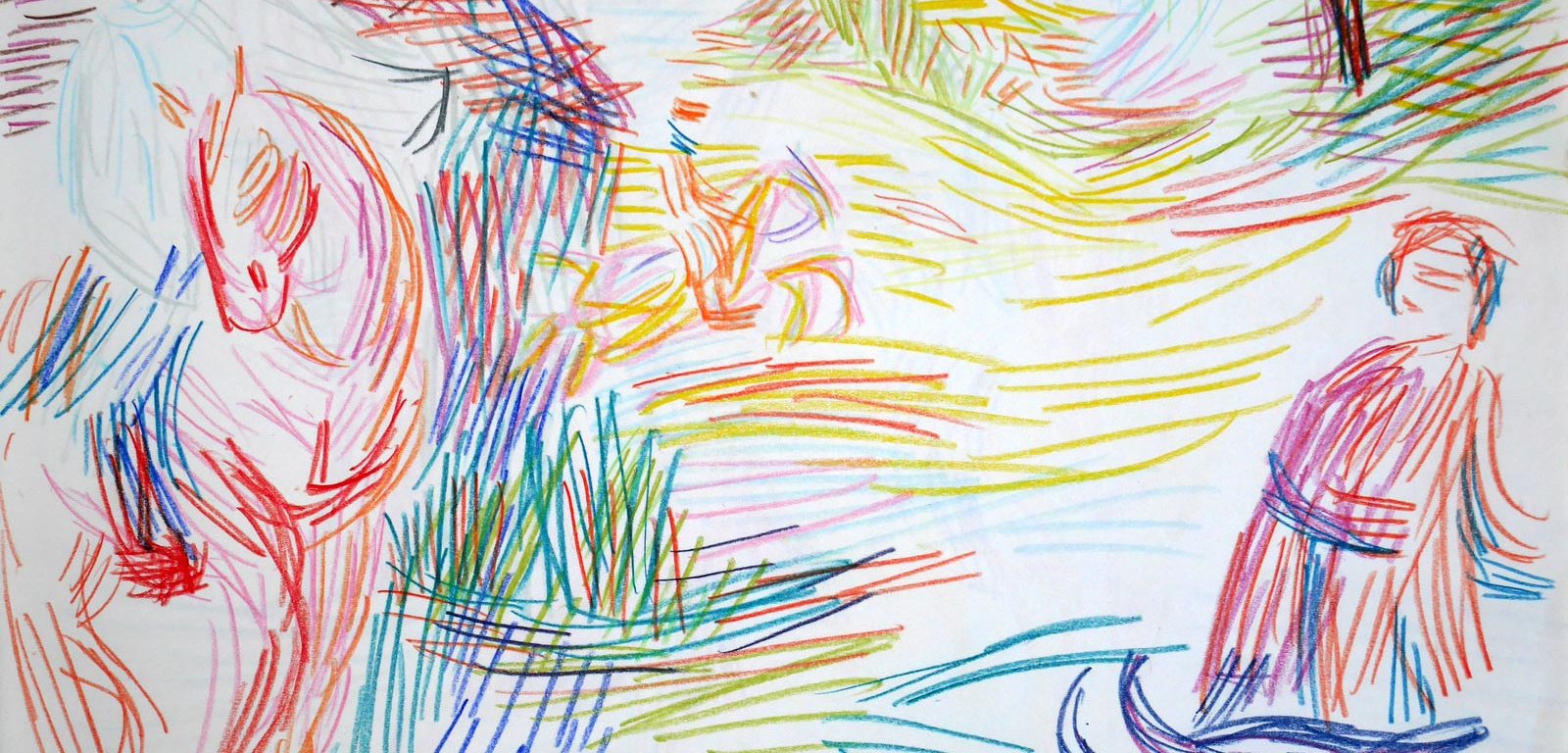 Croquis aux crayons de couleur et au fusain avec des fragments d’une scène de chasse, d’après une tapisserie française// Männer, eine Frau, Pferde und Hunde im Wald : Farbstift- und Kohlekizzen nach einem französischen Wandteppich mit einer Jagdszene