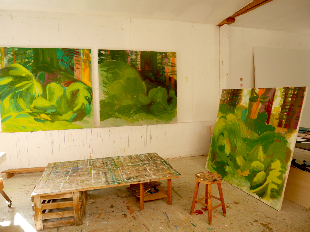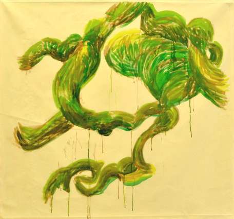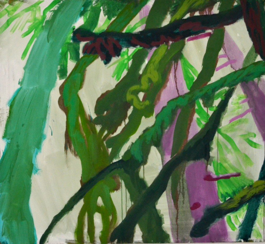 Extension de la série de peintures « Jungle », toujours en cours de réalisation, pigments et tempéra à l’œuf sur toile fixée sur châssis, dimensions variables, entre 80 x 100 cm et 230 x 200 cm, la plupart sont des grands formats.